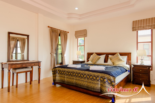 เรือนจันผา ๕ on 28 เมษายน 2557. Posted in บ้านพักหลังเดี่ยว ลักษณะเรือนพัก : เรือนเดี่ยว รายละเอียด : 1 ห้องนอน 1 ห้องน้ำ 2 เตียง 3.5 ฟุต ราคา : หลังละ 3,000 บาท จำนวนผู้เข้าพัก : 2 ท่าน (พร้อมอาหารเช้า) ที่นอนเสริม : - สิ่งอำนวยความสะดวก : แอร์, ทีวีดาวเทียม, ตู้เย็น, เครื่องทำน้ำอุ่น, ชุดรับแขก